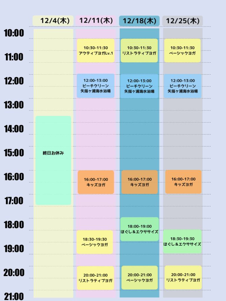 12月4日はヨガクラス、ビーチクリーン共にお休みとなります。